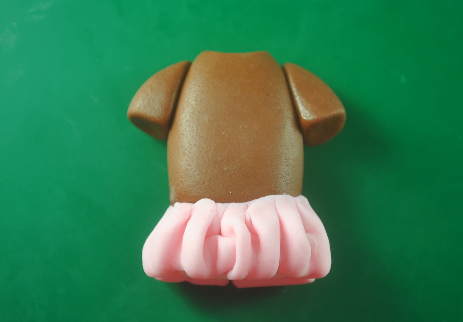 (6) Roll some pink fondant flat. Cut up a long rectangle, fold horizontally.