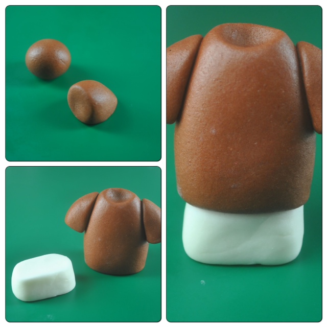(5) Roll two small balls from the brown fondant. Then into tear shapes. Flatten the base and press into the sides of the little girls top Get some white fondant, roll and shape into a flat cylinder and attach to the base of the girls top.