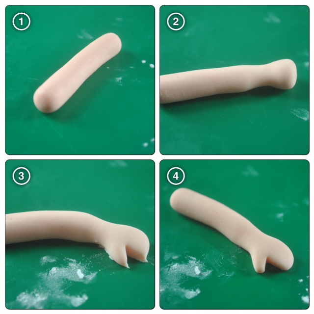 (27) To make the hands, roll flesh fondant into a cylinder – a long cylinder.