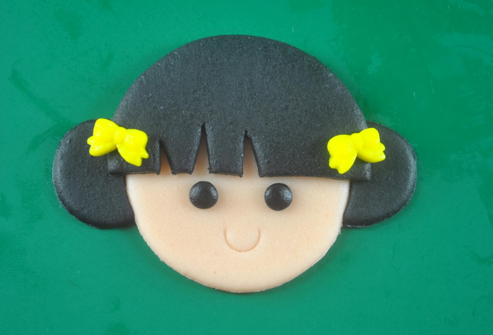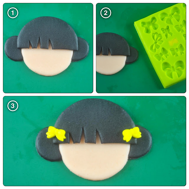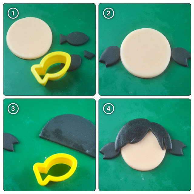 1. Cut out flesh fondant from the smaller round cutter. I have a small fish shaped cutter which I used to achieve the pigtails effect.