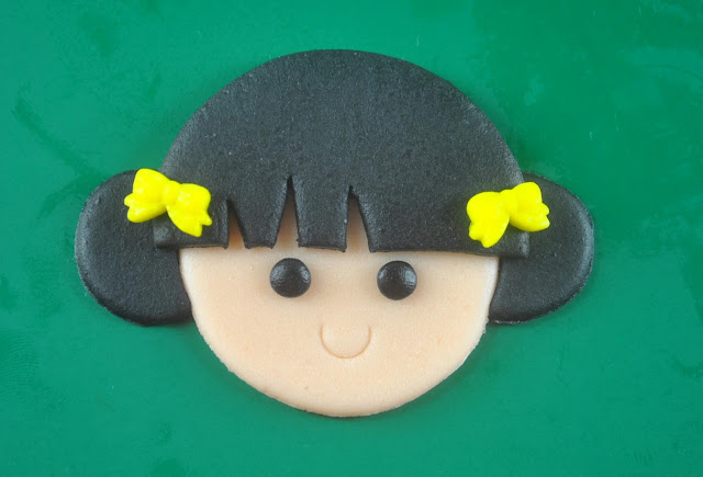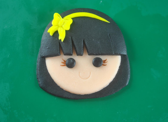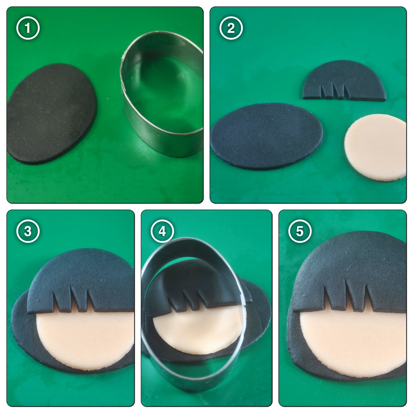 2. Cut out flesh fondant from the smaller round cutter. Cut out black fondant from the bigger round cutter and divide into two. Using the knife, add some “bangs” details on the black half circle