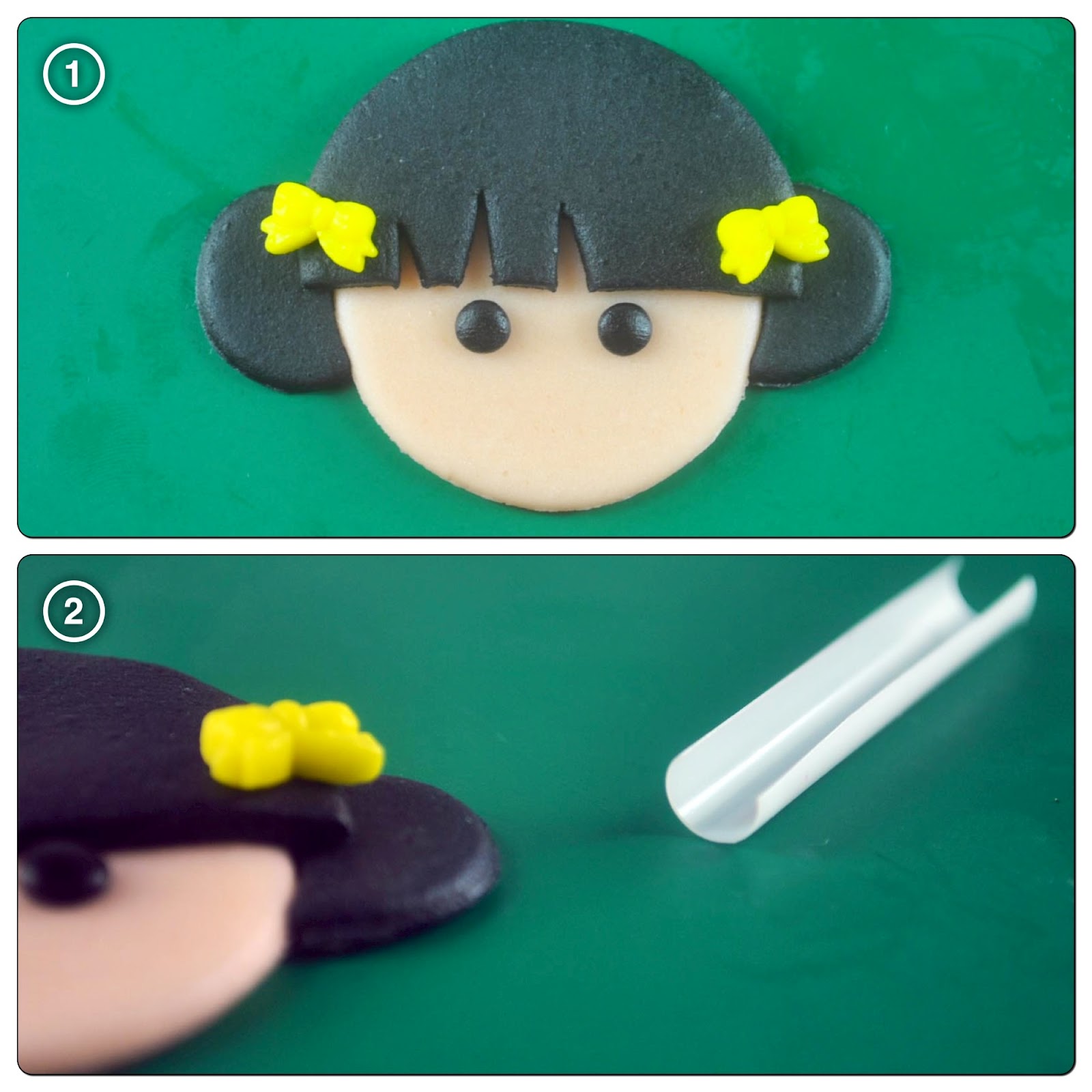 3. Using the knife, add some “bangs” details on the black half circle and attach to the little girl’s head