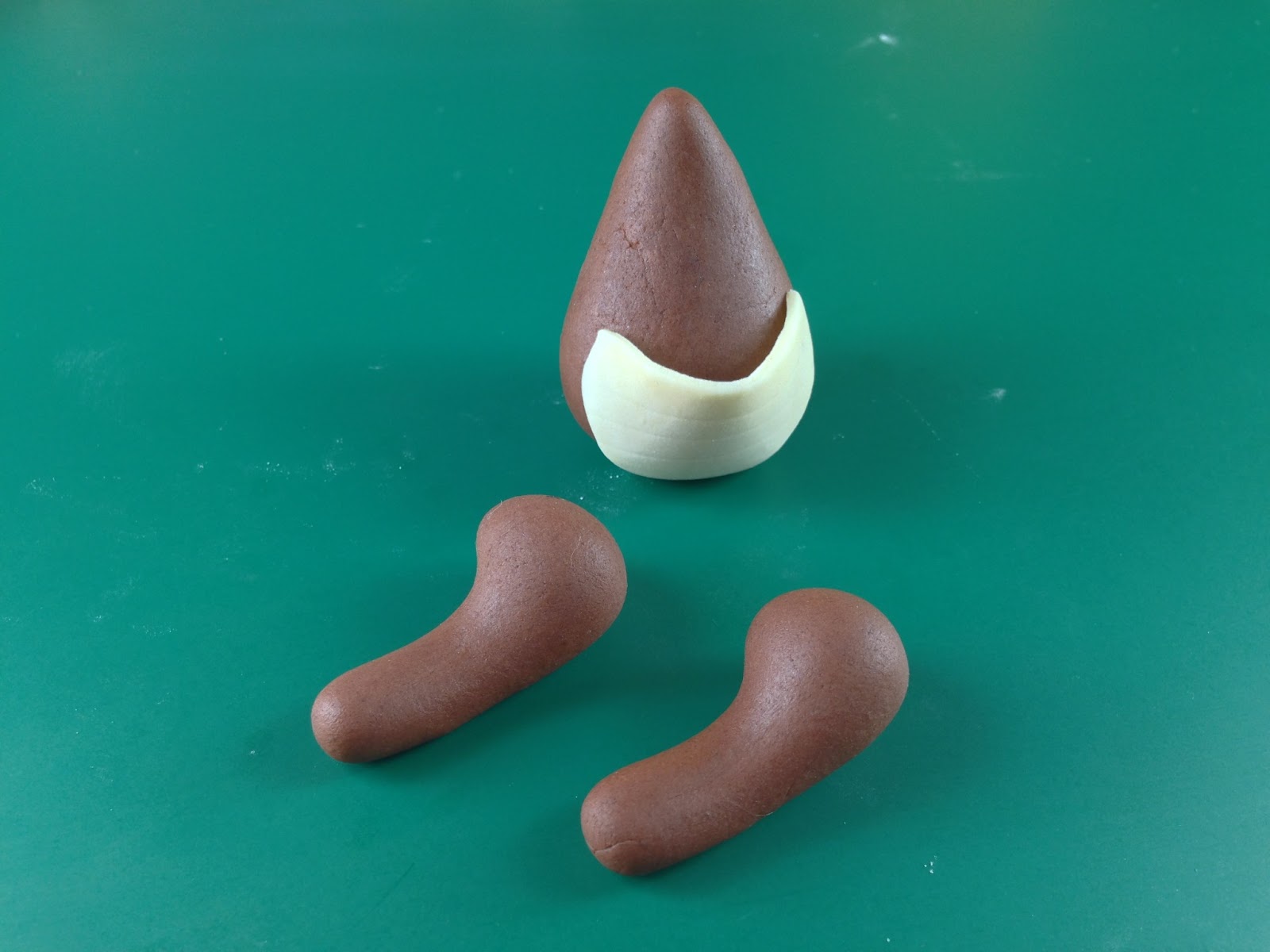 (3) To make the legs, shape 2 pieces of brown fondant like a microphone.