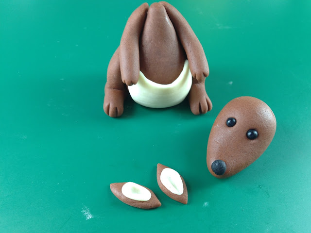 (2) Roll the light brown fondant thinly and cut a half circle. Attach to the kangaroo’s belly like a pouch, leaving an opening at the top.