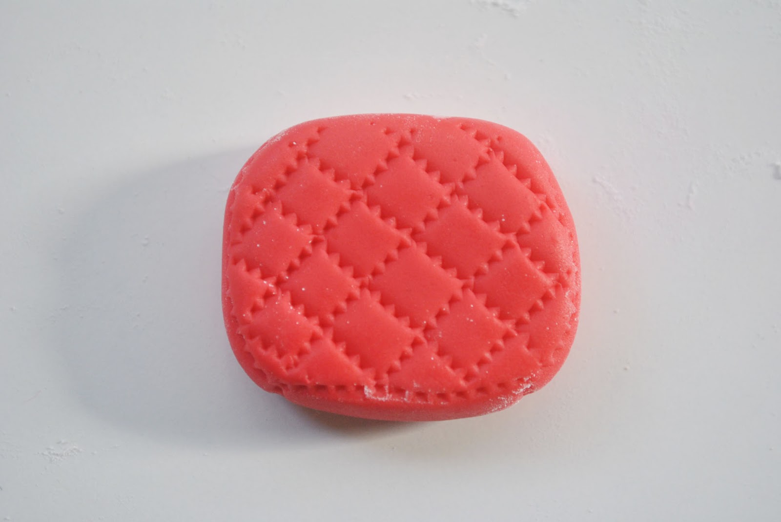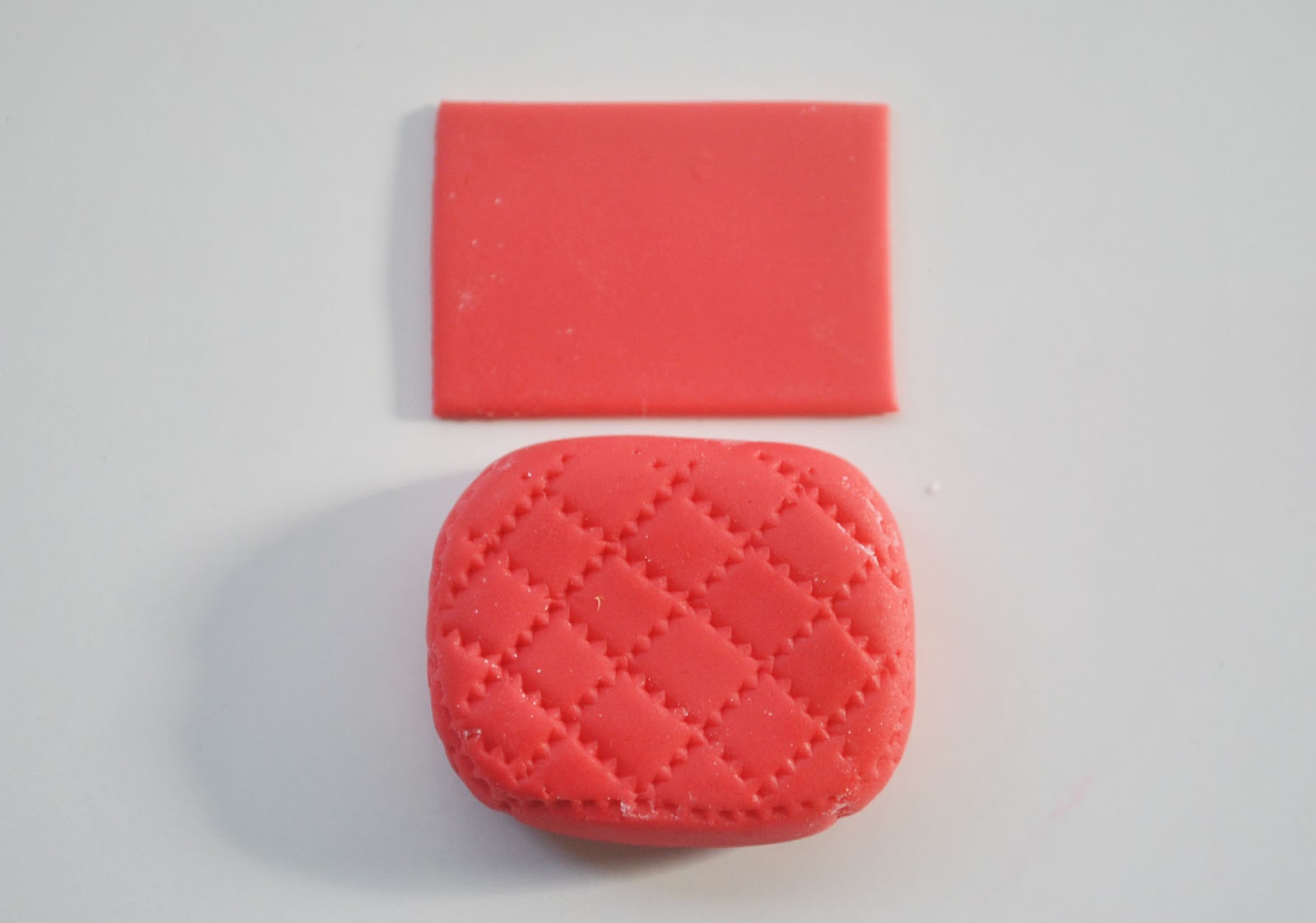 (1) Roll red fondant into a ball, press it flat and shape into a rectangle. Make sure to retain the round edges.