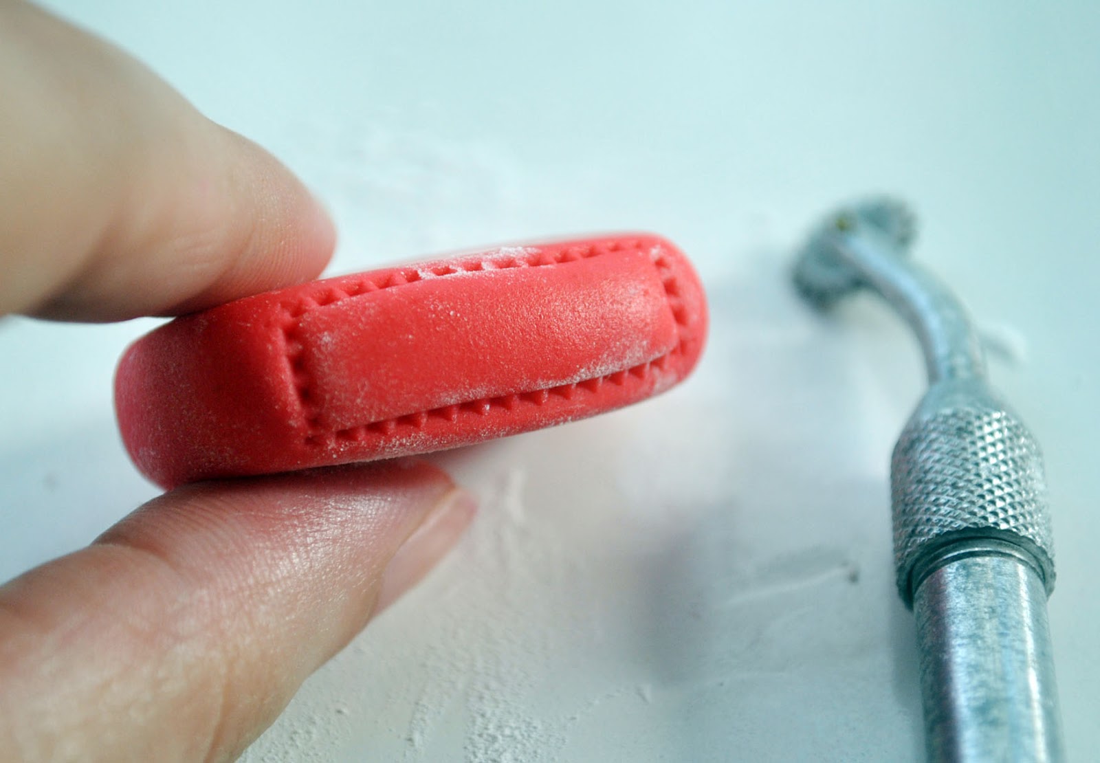 (7) Repeat steps 3 and 4 on to the rolled red fondant.